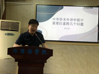 池水涌教授的讲座题目是“中华学术外译申报中需要注意的几个问题”,主要包括四个方面的内容:要做好选题工作、要写好外译项目申请书、要打磨好翻译样章、要做到知难而进,并详细分析了申报项目的具体准备工作流程,指导大家落实项目准备工作。