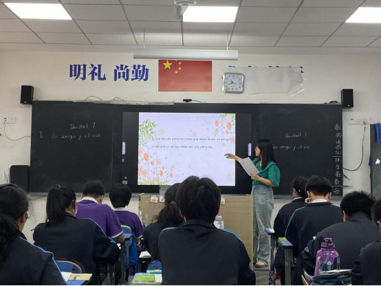 会议结束后,王佳副院长一行在武汉市第二十九中学校长陈建伟、副校长陈文、西语班教师段想、杨雅晶的陪同下,一起观摩聆听了我校西班牙语系实习生为该校高二学生上的一节西班牙语课并合影留念。