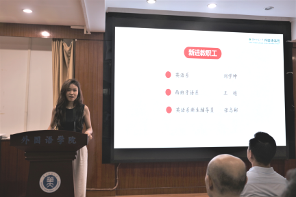 会议伊始,麻旎书记隆重向大家介绍了3名新教职工:英语系刘学坤、西班牙语系王越和新生辅导员张志彬,并对他们的加入表示诚挚的祝贺和热烈的欢迎。