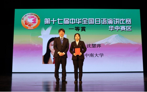 来自中南大学的沈慧萍同学荣获一等奖;驻中华人民共和国日本国大使馆新闻文化中心二等秘书樱井真一先生为一等奖获奖选手颁奖。